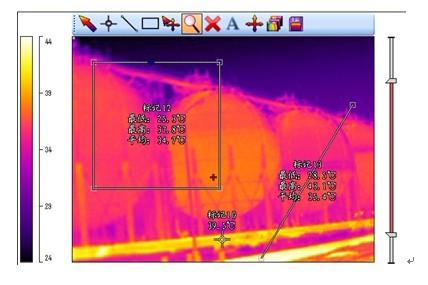 可以對熱像圖進(jìn)行區(qū)域分析、點(diǎn)分析和線分析,實(shí)時顯示所選區(qū)域最高、最低和平均溫度,如圖所示:
