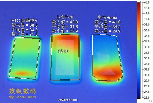 通過(guò)兩個(gè)階段的測(cè)試結(jié)果看,小米手機(jī)在30分鐘視頻播放+12分鐘的游戲之后,機(jī)身最高溫度達(dá)到了45°,確實(shí)有些駭人。