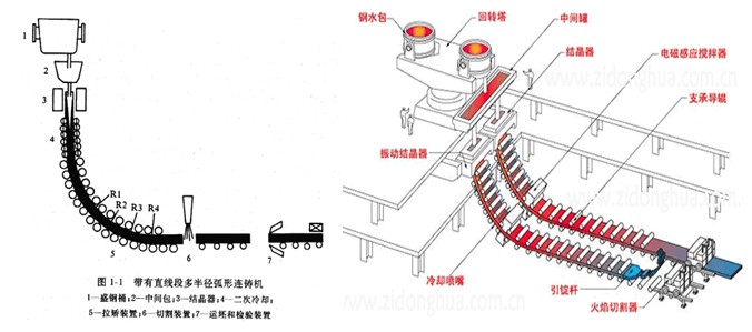 一臺(tái)連鑄機(jī)主要是由盛鋼桶運(yùn)載裝置、中間包、中間包車、結(jié)晶器、結(jié)晶器振動(dòng)裝置、二次冷卻裝置、拉坯(矯直)裝置、切割裝置和鑄坯運(yùn)出裝置等部分組成的。