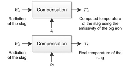 The emissivity of the molten pig iron and the emissivity of the slag are constants. Therefore, (10) can be expressed as (11),where k is equal to