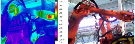 但由于車身焊接機(jī)器人的電纜線因經(jīng)常處于運(yùn)動狀態(tài),在折疊處電纜線和冷卻水管較易發(fā)生斷裂,該故障發(fā)生概率較高,也是設(shè)備維護(hù)部門重點(diǎn)關(guān)注的現(xiàn)場。維護(hù)部門可以根據(jù)機(jī)器人電纜表現(xiàn)出來的溫度分布及變化趨勢,從而非常方便對機(jī)器人進(jìn)行維護(hù)和操作。