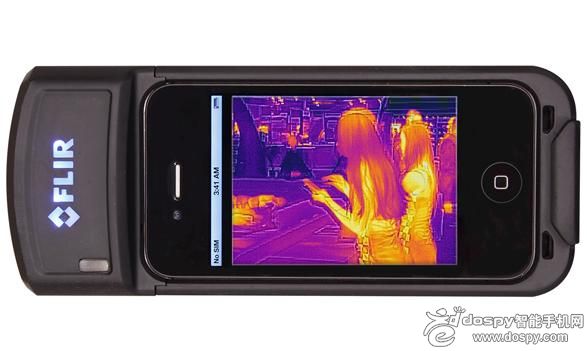 這種裝置比笨拙且體積龐大的夜視鏡要好多了。在華盛頓特區(qū)舉辦的2013 AUVSI展會(Association for Unmanned Vehicle Systems Internationl,國際無人機系統(tǒng)協(xié)會),一家名字正好就是FLIR的公司就向全世界展示了一款類似手機外殼一樣的、用于蘋果iPhone手機的精巧裝置,該裝置(原型機,如圖)整合了一款商用紅外熱像攝像頭。這款針對iPhone的紅外攝像頭就是FLIR公司的Quark(夸克)相機核心系列之一。