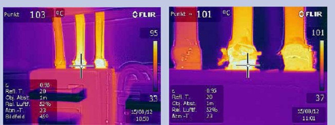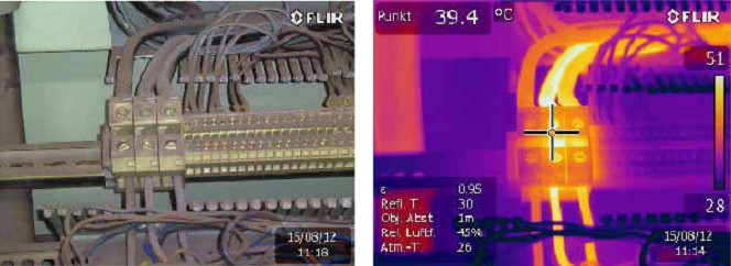 斷路器內(nèi)的電纜連接圖像。電纜塑料涂層已出現(xiàn)大量孔隙,絕緣層也在脫落,溫度超過(guò)60℃,這表明設(shè)備存在很嚴(yán)重的問(wèn)題。要找出問(wèn)題的原因所在,必須檢查斷路器中保險(xiǎn)絲是否出現(xiàn)問(wèn)題,電纜連接點(diǎn)的觸點(diǎn)電阻是否過(guò)大(氧化所致)等等。然后,必須替換部分電纜或者剪短(如果電纜夠長(zhǎng))、去除及重新連接。