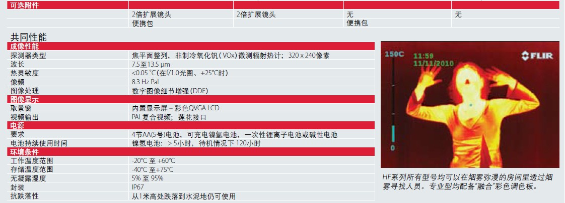 HF系列產(chǎn)品并非專為滿足NFPA 1801的要求或類似國家標(biāo)準(zhǔn)(專門規(guī)定用于存在火災(zāi)危險的極端現(xiàn)場環(huán)境中的消防熱成像儀)而設(shè)計。HF系列產(chǎn)品僅符合上表中所述規(guī)格,僅在煙霧彌漫的環(huán)境和非極端環(huán)境下用作輔助工具,在火災(zāi)危險區(qū)域以外為消防人員提供協(xié)助和/或?qū)γ骰鹨严鐓s由于煙霧、蒸汽、光線不佳或其它光線限制條件而很難巡查的區(qū)域進行檢查。